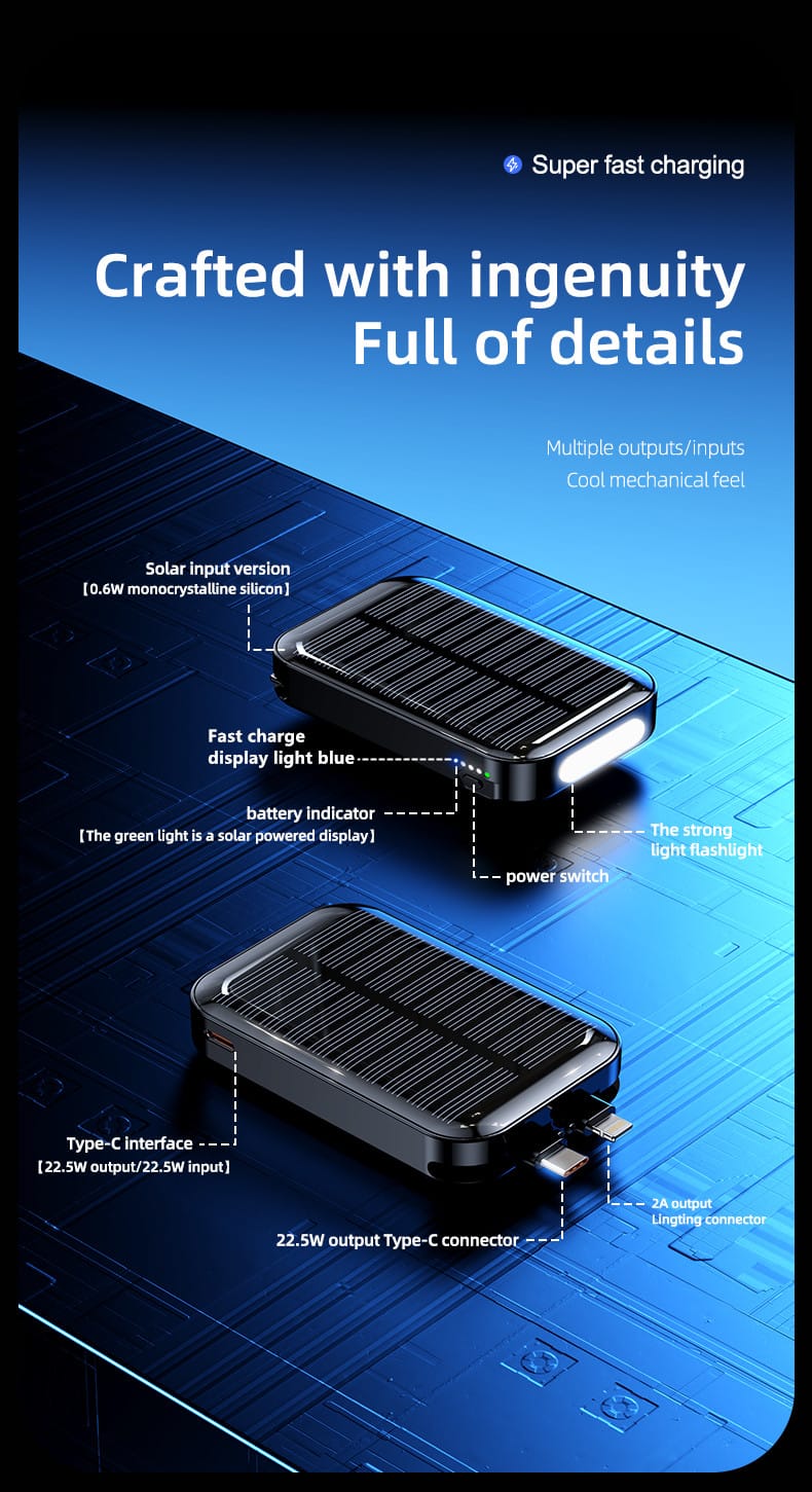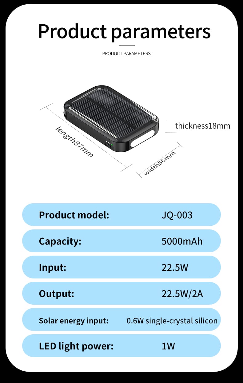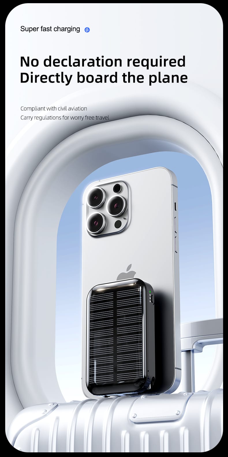 מטען נייד סולארי מהיר 5000mAH 22.5W קומפקטי נכנס לכל כיס מקבל הטענה גם מהשמש מגיע עם 2 יציאות אחת usb C, ואחת Lingting.